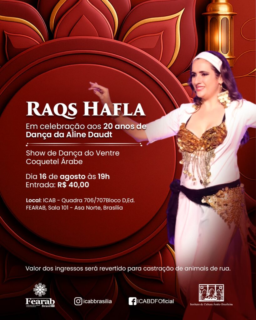 Em celebração aos 20 anos de Dança da Aline Daudt Show de Dança do Ventre Coquetel Árabe Dia 16 de agosto às 19h Entrada: R$ 40,00 Local: Instituto de Cultura Árabe Brasileira – Quadra 706/707 Bloco D, Ed. FEARAB, Sala 101 – Asa Norte, Brasília Valor dos ingressos será revertido para castração de animais […]