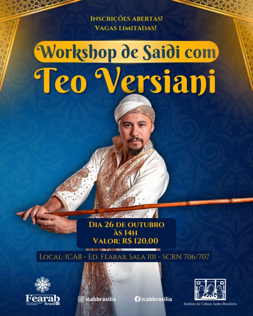 Dia 26 de outubro às 16h Valor: R$ 120,00 Local: ICAB – Ed. Fearab, Sala 101 – SCRN 706/707 Inscrições abertas! Vagas limitadas! Em outubro o Icab irá receber o grande profissional das danças árabes, Teo Versiani, diretamente de São Paulo. Ele irá ministrar 2 aulas com os temas Saidi e Dabke. O saidi […]