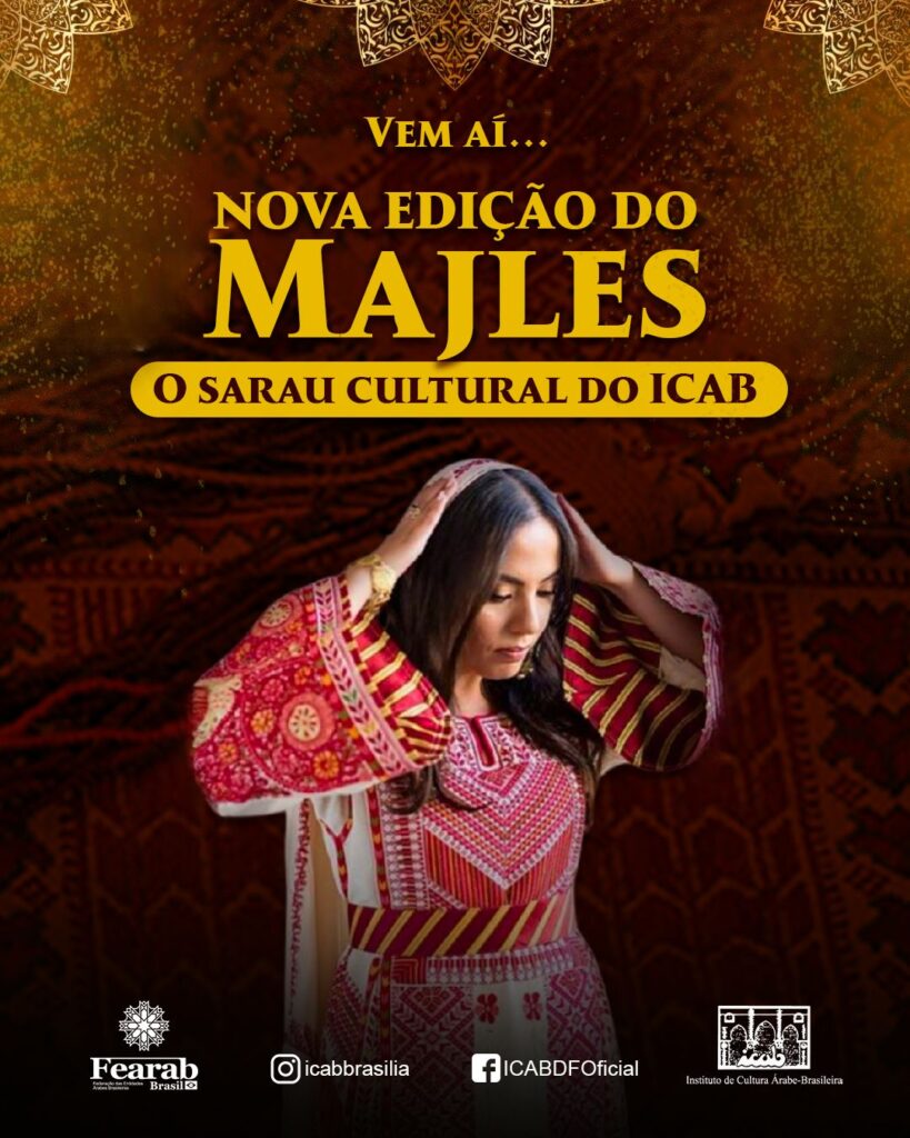 Sarau cultural anual do ICAB, dedicado à memória, resistência e cultura palestina. O Instituto de Cultura Árabe Brasileira (ICAB) convida você para o MAJLES 2025, nosso sarau cultural anual, que acontecerá em 27 de setembro (sábado), das 16h às 19h, em Brasília. Este ano, o encontro será inteiramente dedicado à Palestina, unindo memória, […]