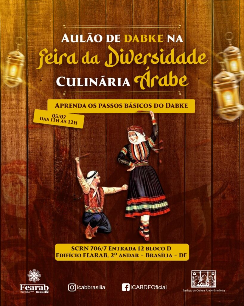 No dia 05/07 o Icab realizará a Feira da Diversidade Culinária Árabe, na mesma oportunidade você pode aprender os passos básicos do Dabke, uma dança alegre, muito praticada em grande celebrações da comunidade árabe. Aulão gratuito com nossa professora Samara Sayed. Mais informações: (61) 98240503