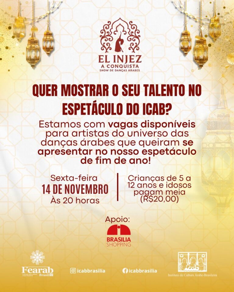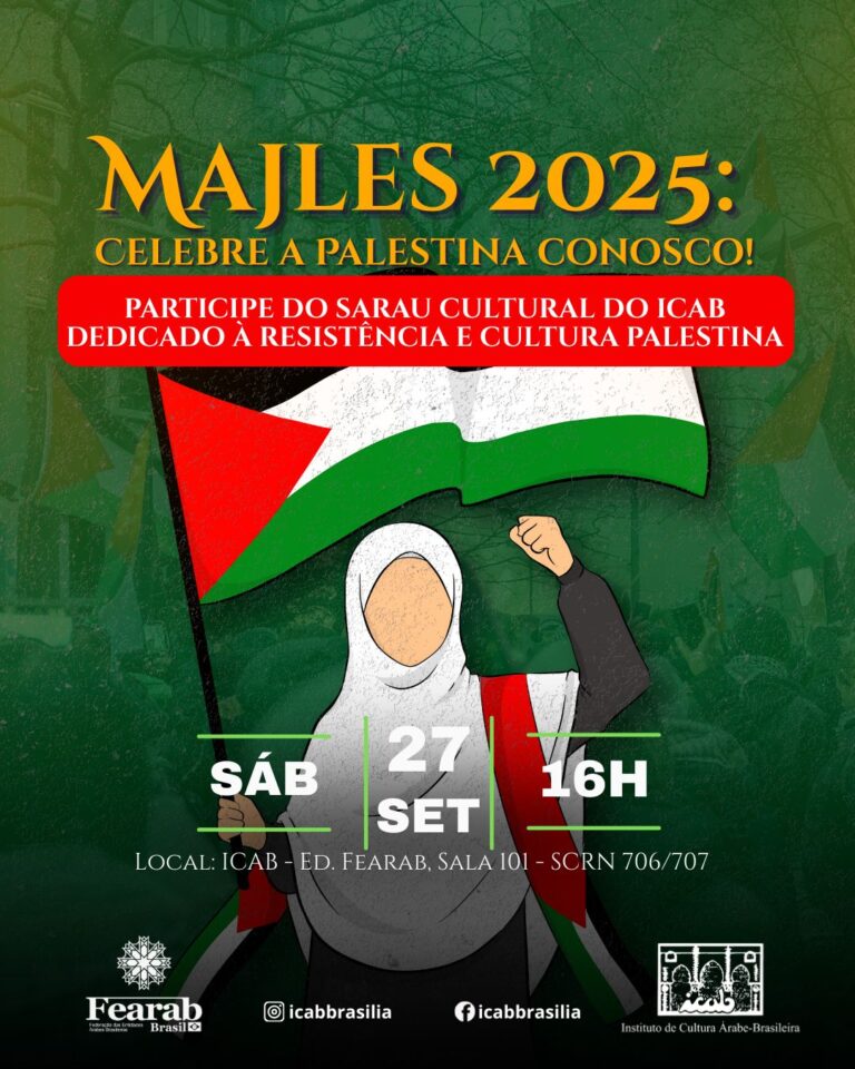 Sarau cultural anual do ICAB, dedicado à memória, resistência e cultura palestina. O Instituto de Cultura Árabe Brasileira (ICAB) convida você para o